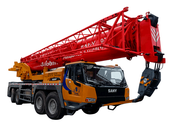 Guindaste móvel SANY montado sobre caminhão, equipado com lança telescópica treliçada de alta resistência, projetado para operações de içamento pesado com máxima segurança e eficiência. O equipamento apresenta estrutura robusta, sistema hidráulico de alto desempenho e gancho com capacidade nominal de até 60 toneladas, garantindo precisão nas manobras e excelente estabilidade operacional.